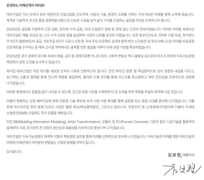 대표이사는 “안전 최우선·친환경 기술 기반 성장·철저한 리스크 관리”를 핵심 경영 원칙으로 제시하며