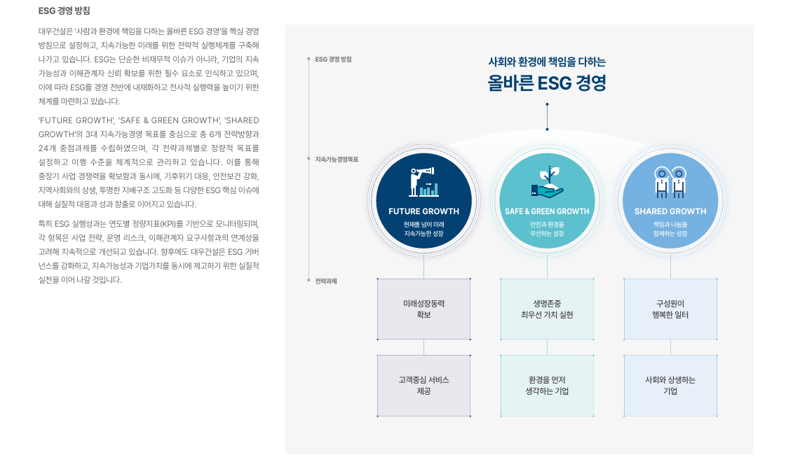 대우건설은 ESG를 크게 아래 3개의 축으로 운영합니다.