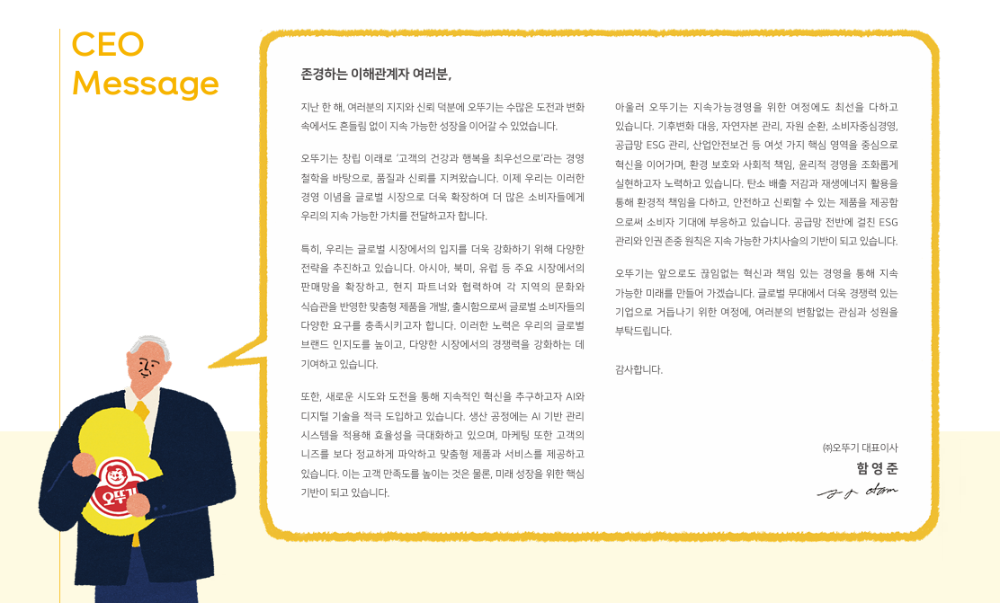 특히, “지속 가능한 식품 생태계를 구축하고 미래 세대를 위한 책임 있는 기업이 되겠다”는 메시지를 강조하고 있습니다.