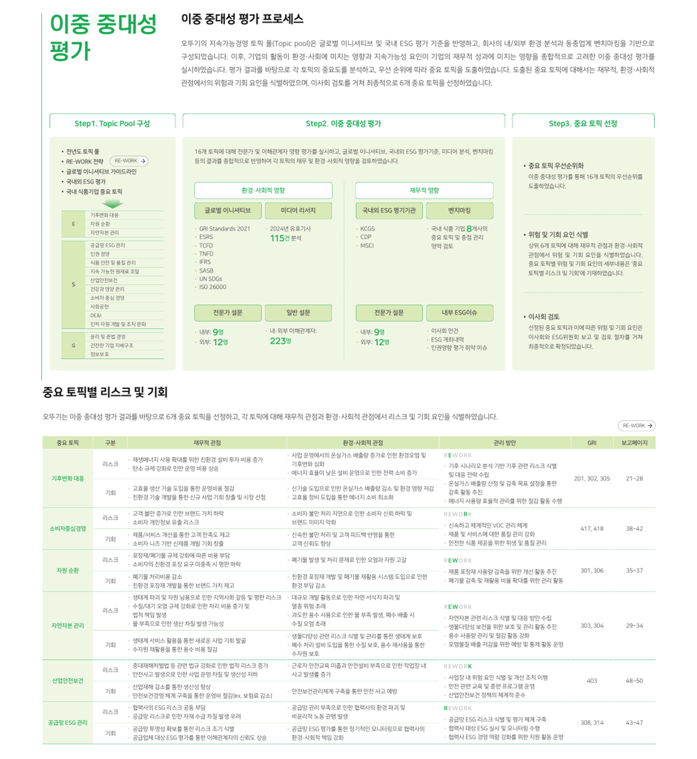 오뚜기는 국제 가이드라인(GRI Standards)에 따라 중대성 평가를 실시하여