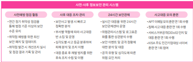 취약점 점검·보안코딩·24시간 관제를 체계화했습니다.