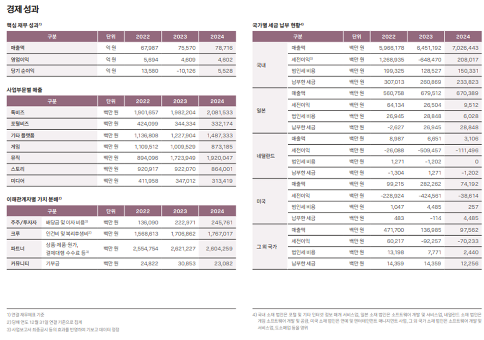 카카오는 2024년 매출 7.87조 원, 영업이익 4,602억 원을 기록했고,