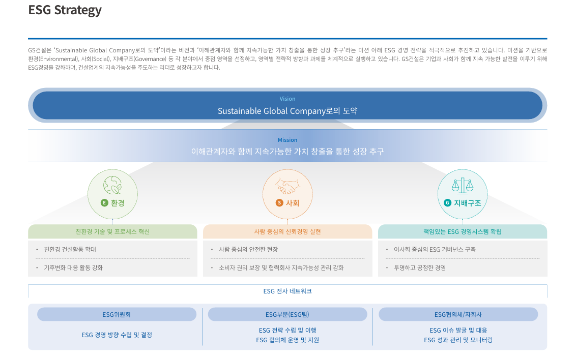 GS건설은 ESG를 기업 경영의 핵심 가치로 재정립하며 다음과 같은 ESG 비전과 전략을 제시하고 있습니다.