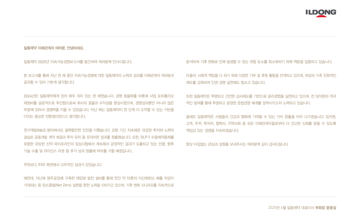 일동제약은 2025 보고서를 통해 ‘건강한 내일을 위한 지속가능한 동반자’라는 기업 비전을 재확인하며,