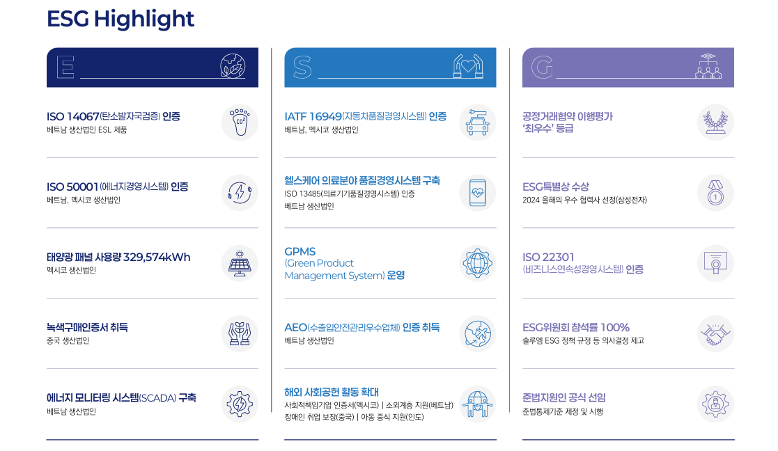 솔루엠이 구축한 ESG 체계는 미래 글로벌 고객사 요구와 규제 환경을 고려할 때 경쟁력 확보의 필수 요소입니다.