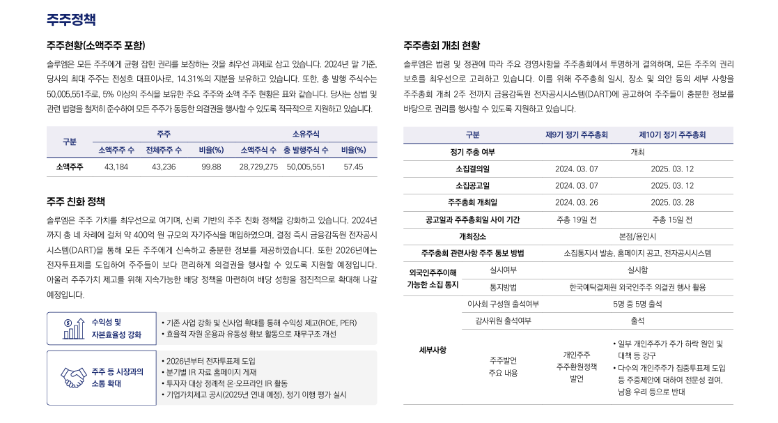 정기적인 주주 소통, 배당 정책 공개, 전자투표제 확대 등 주주 권익 보호에 적극적이며