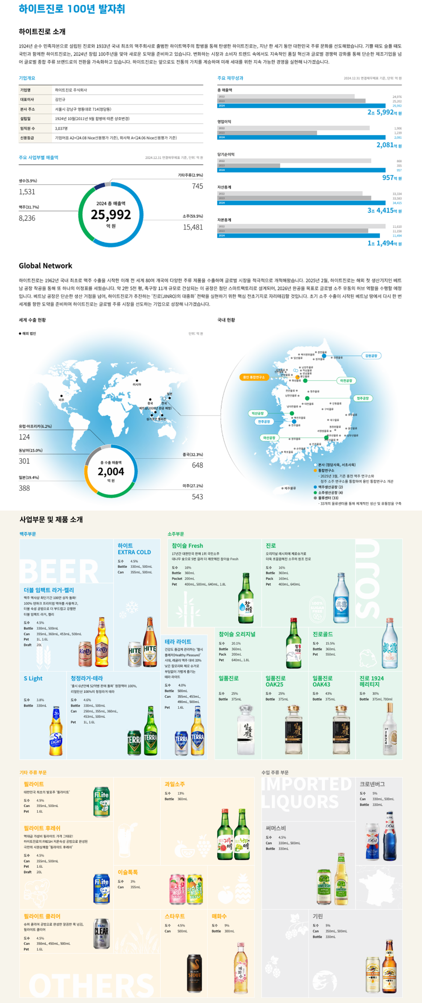 전통 제조 기반을 넘어 글로벌 소주 브랜드 JINRO를 중심으로 해외 시장 확장을 가속하고 있습니다.