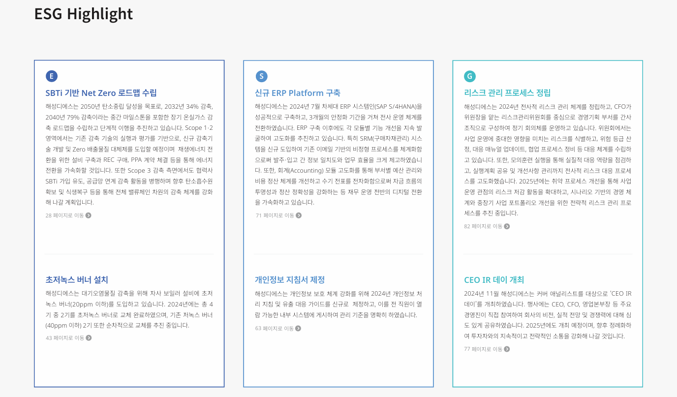 해성디에스는 환경·사회·지배구조 전 분야에서 실행 중심의 ESG 전략을 갖춘 기업으로 평가됩니다.