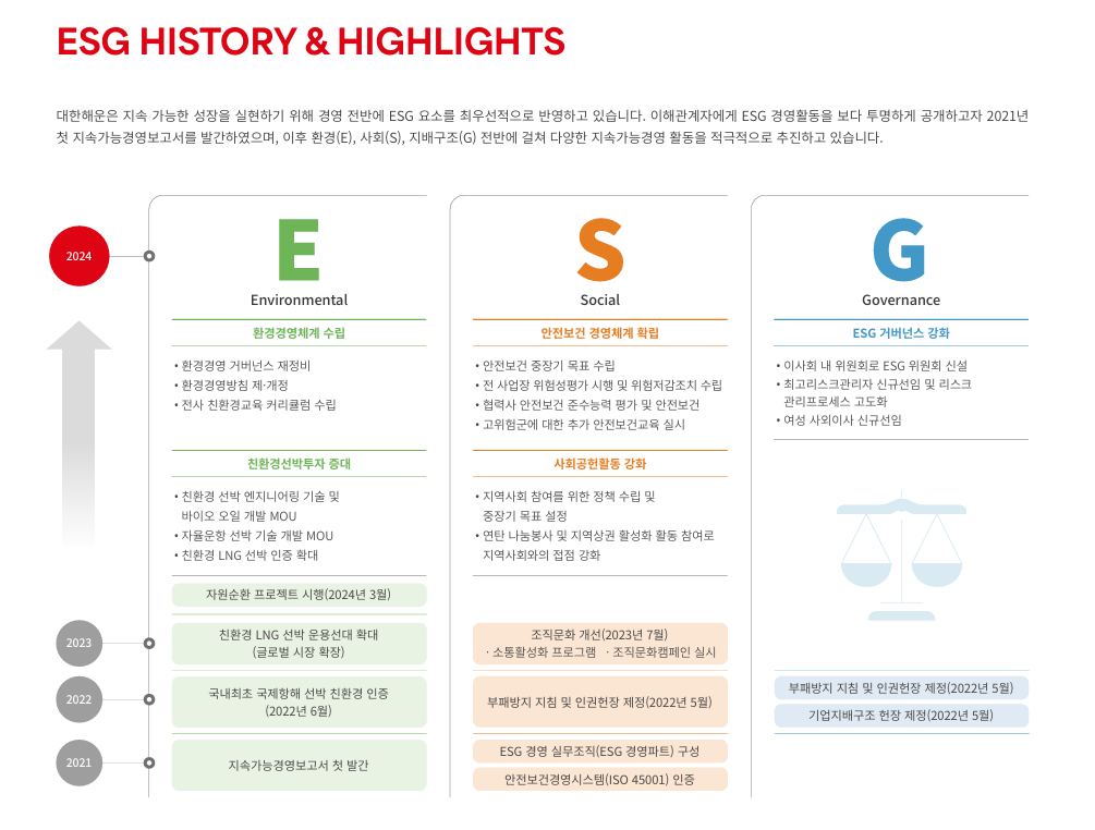대한해운은 “지속 가능한 미래를 도모하는 신뢰받는 모범 기업”을 ESG 비전으로 제시하며,