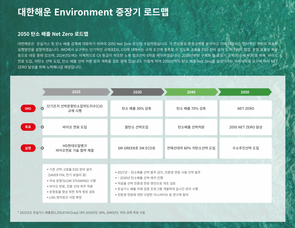 대한해운의 환경 전략은 해운업 본질인 “탄소배출 절감”을 중심에 두고 있습니다.