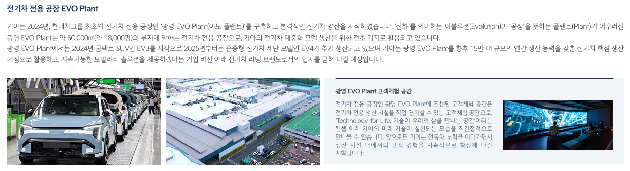 기아는 2024년 광명 EVO Plant를 가동하며 전기차 전용 생산체계를 구축했습니다.