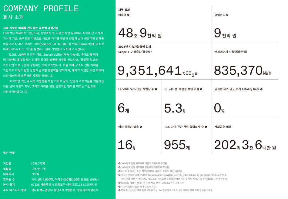 2024년 매출은 48조 9천억 원, 영업이익 9천억 원, 글로벌 31개 사업장을 통해 9,351,641tCO₂e의 배출량을 관리하며