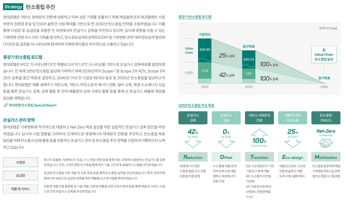 현대로템은 2040년 Scope1·2 탄소중립, 2050년 공급망(Scope3) 포함 Net Zero를 목표로 하고 있습니다