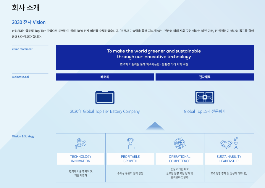 삼성SDI는 ‘초격차 기술력을 통해 지속가능한 친환경 미래 사회 구현’을 2030년 전사 비전으로 제시했습니다.