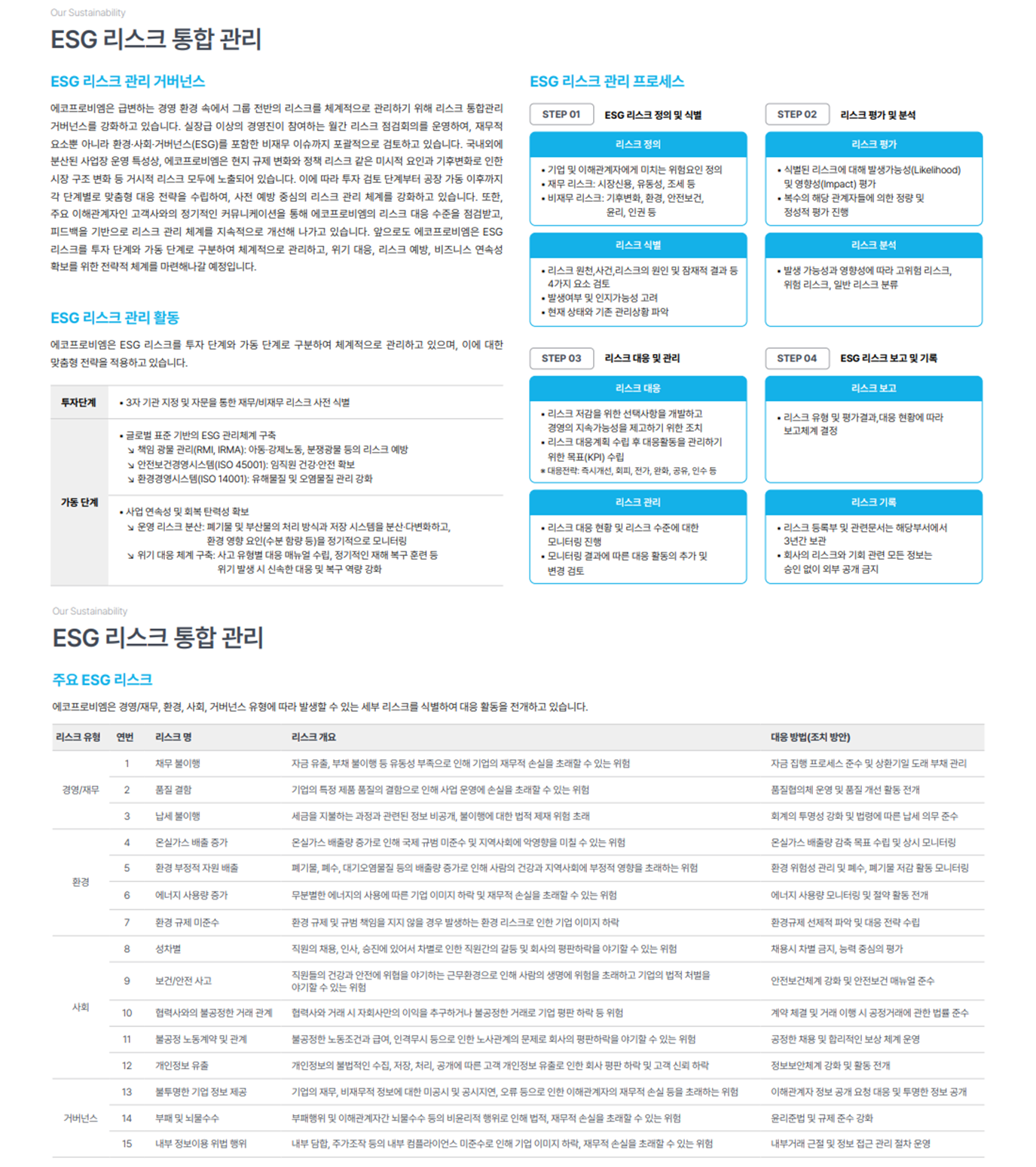 여기서 재무 리스크(채무, 품질, 납세)뿐 아니라 온실가스·에너지·환경오염·안전사고·부패·정보보안 등