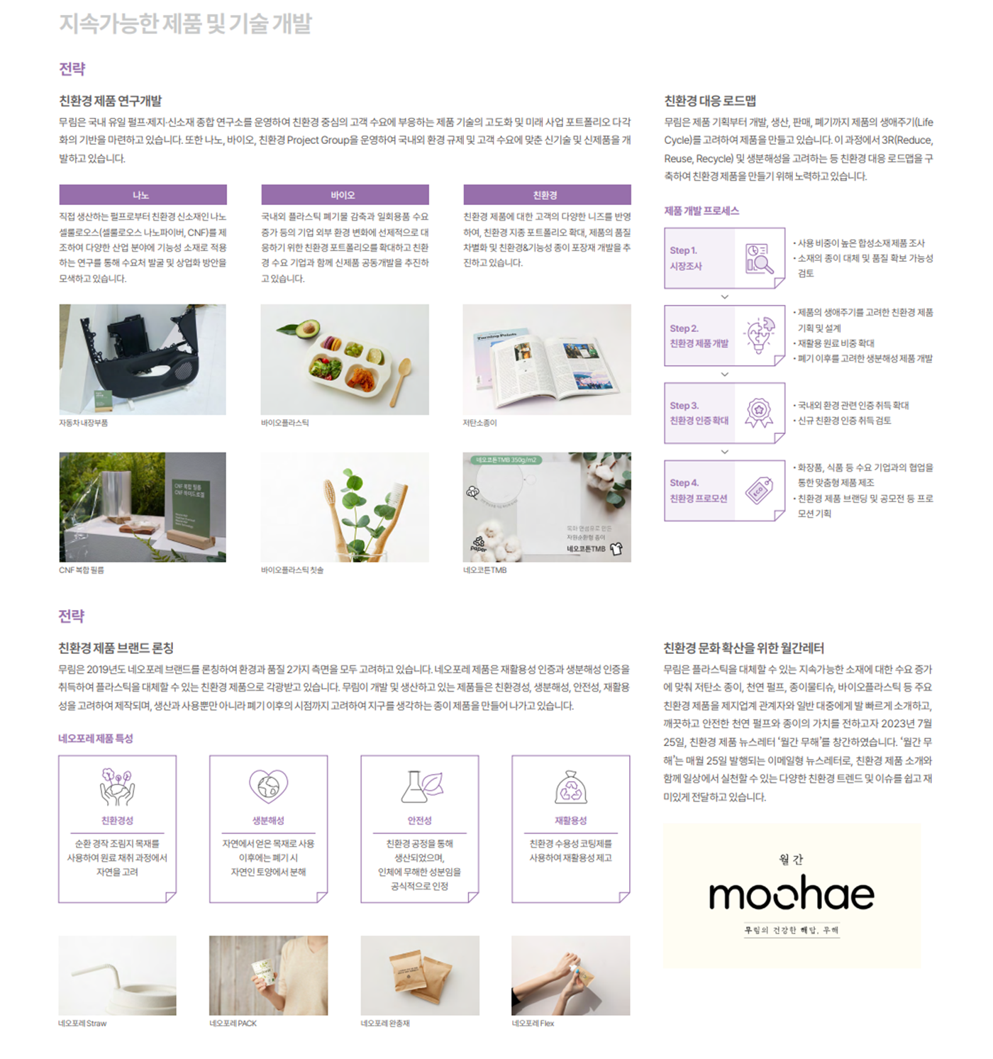 무림은 보고서에서 여러 친환경제품을 소개합니다.