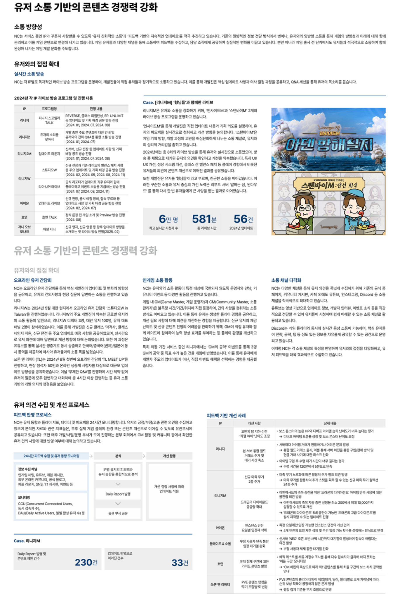 보고서에서 가장 많은 분량을 차지하는 부분은 바로 유저 소통 강화입니다.