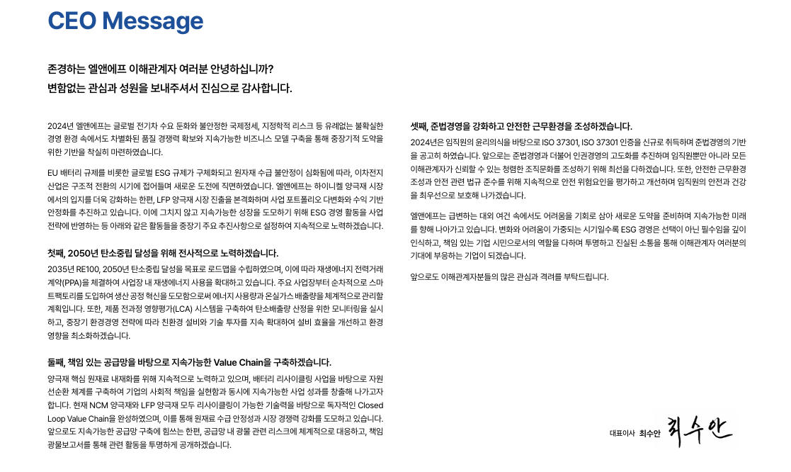 2024 엘앤에프 지속가능경영보고서는 단순한 ESG 활동 보고서를 넘어,