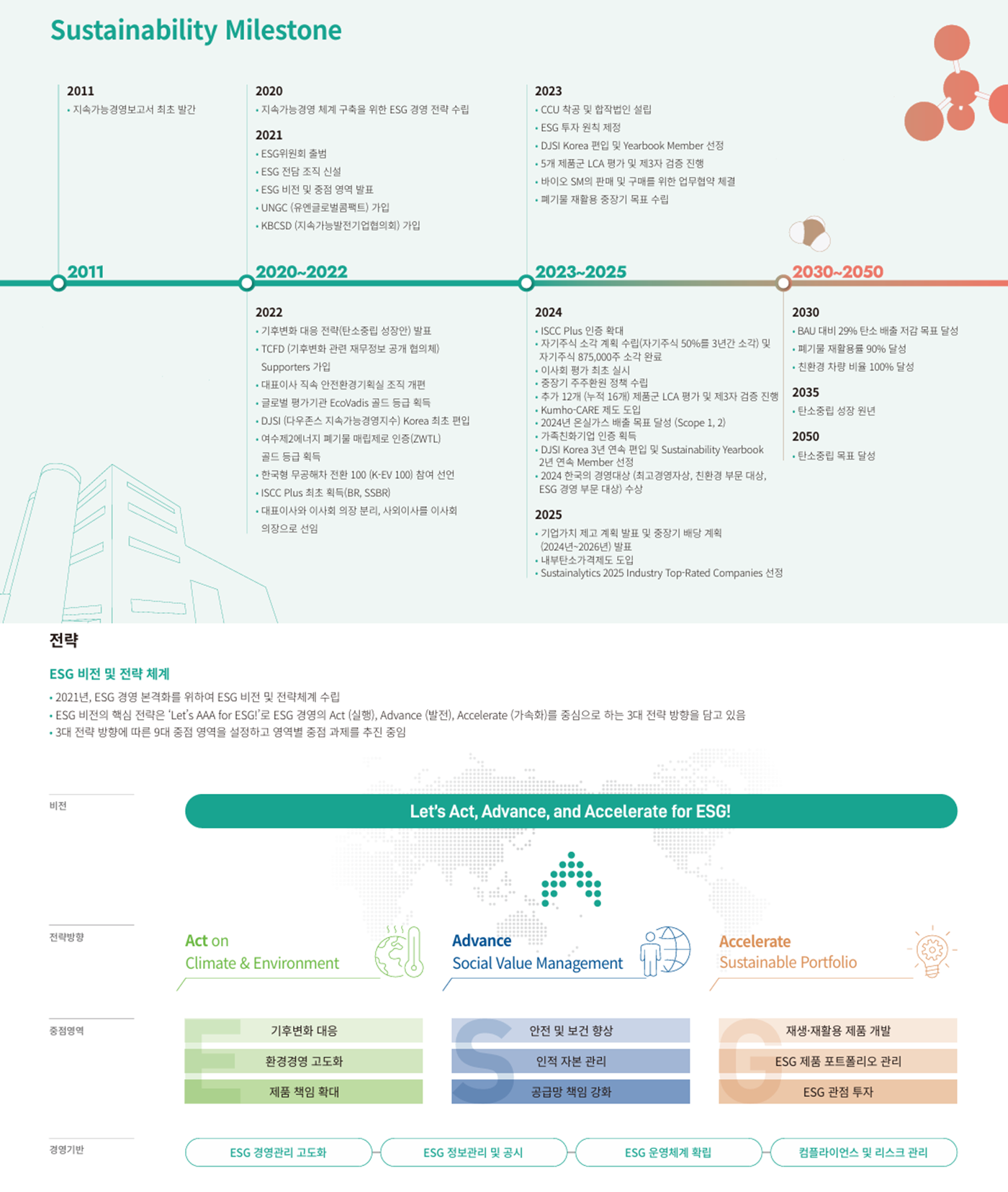 “Let’s Act, Advance, Accelerate for ESG!”라는 비전을 수립하였습니다.