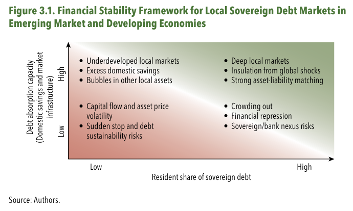 신흥·개도국(EMDE) 정부부채가 늘어나는 가운데, 로컬 통화 국채시장(LCBM)이 커지고